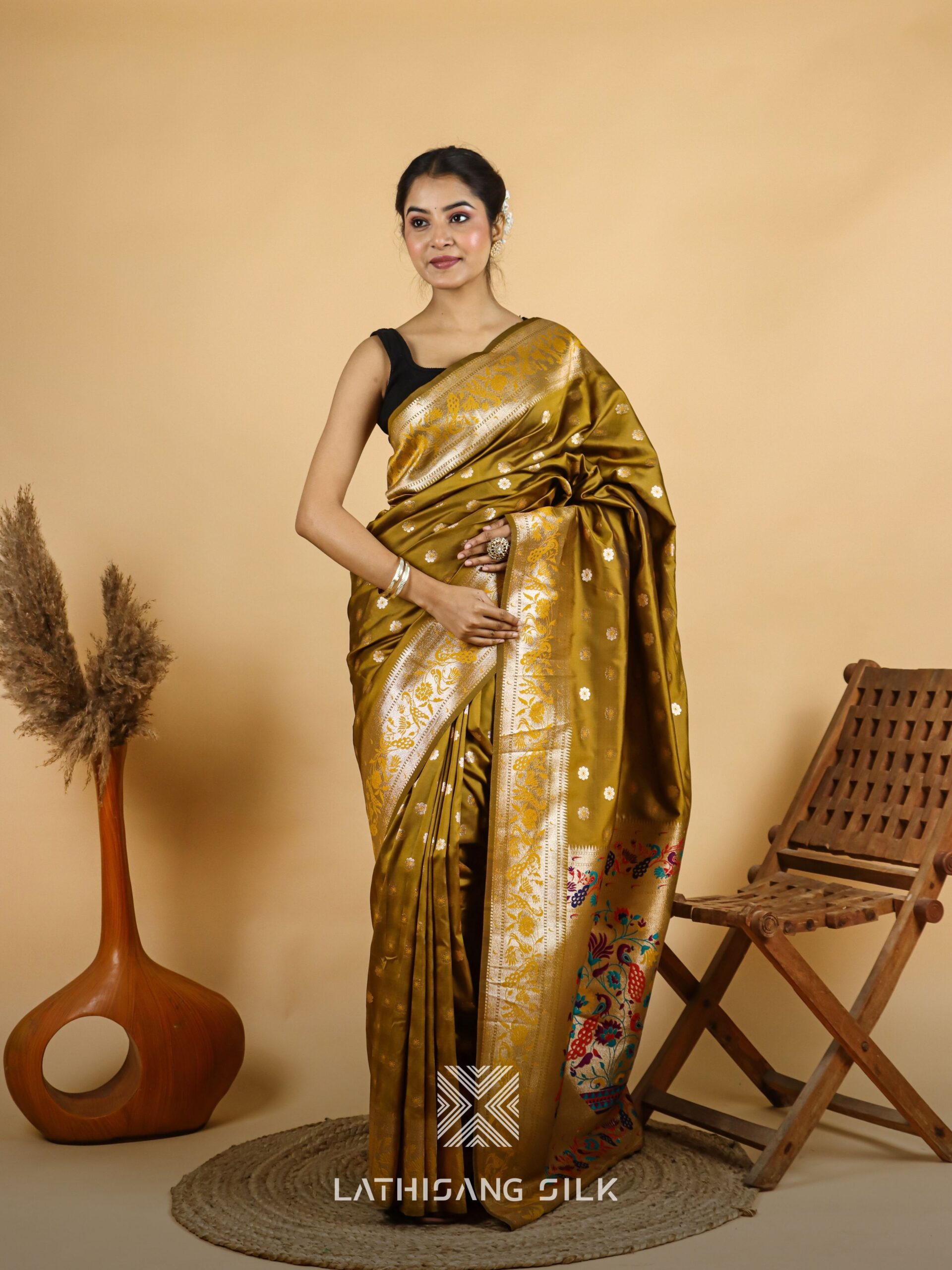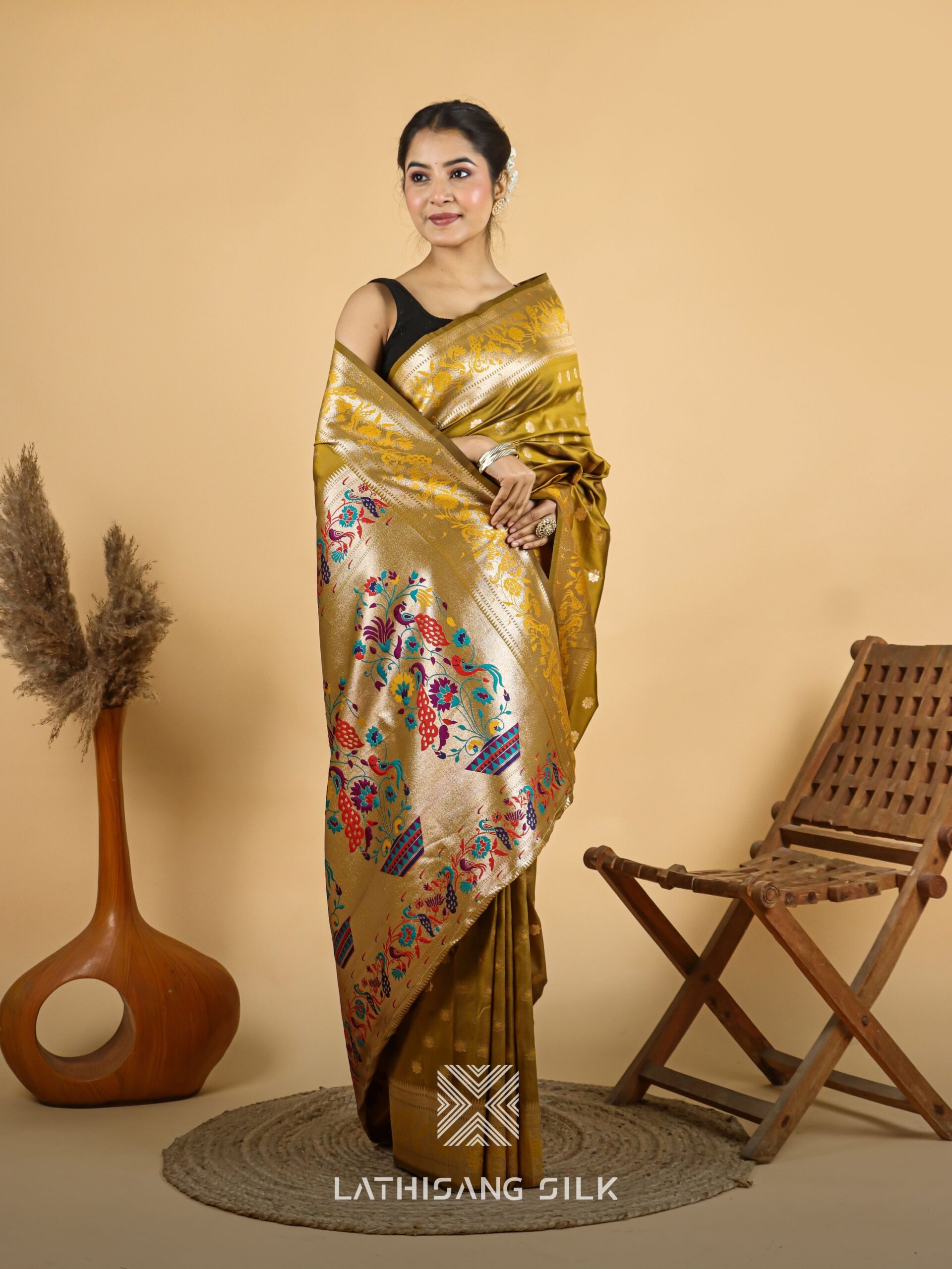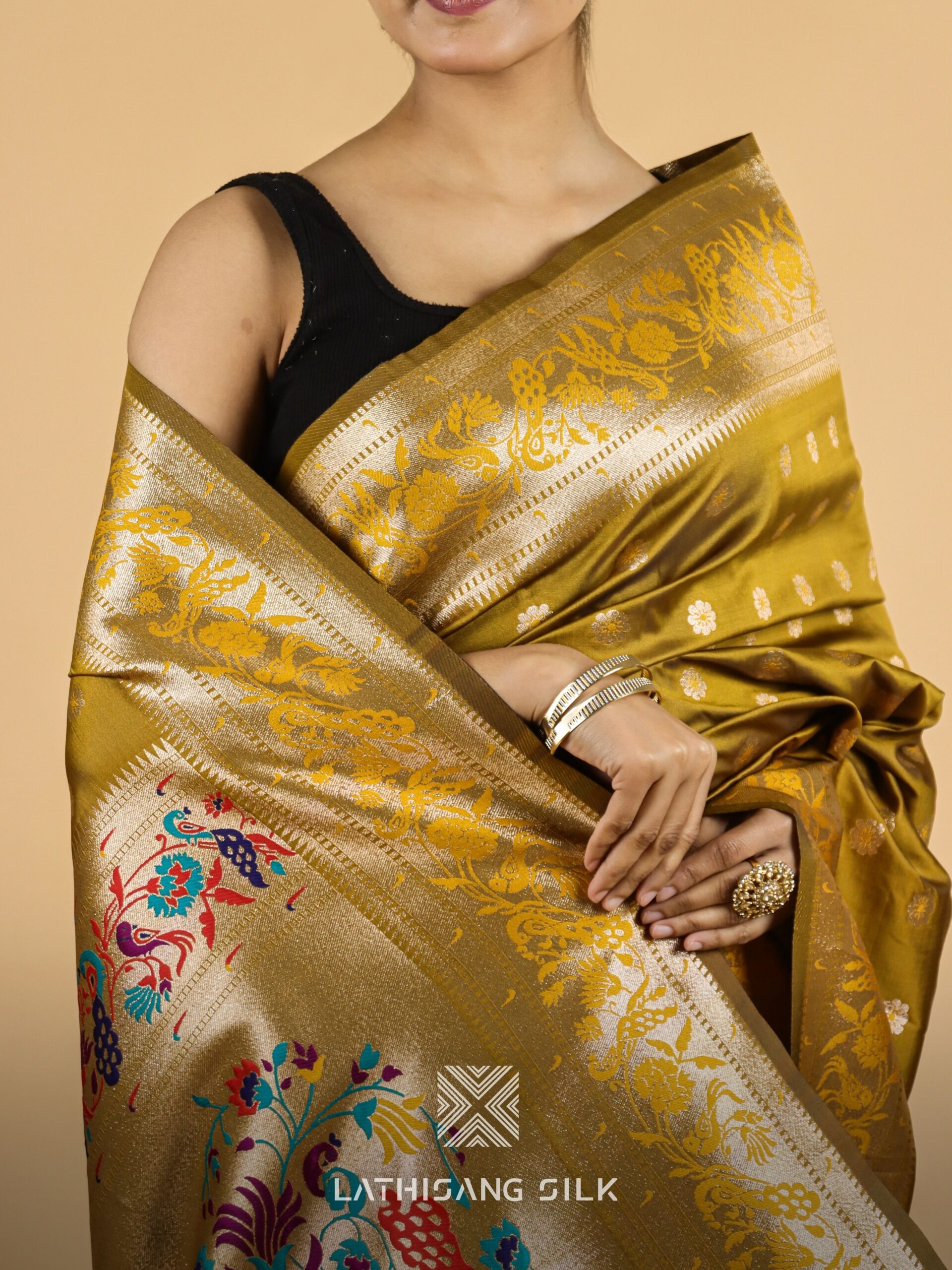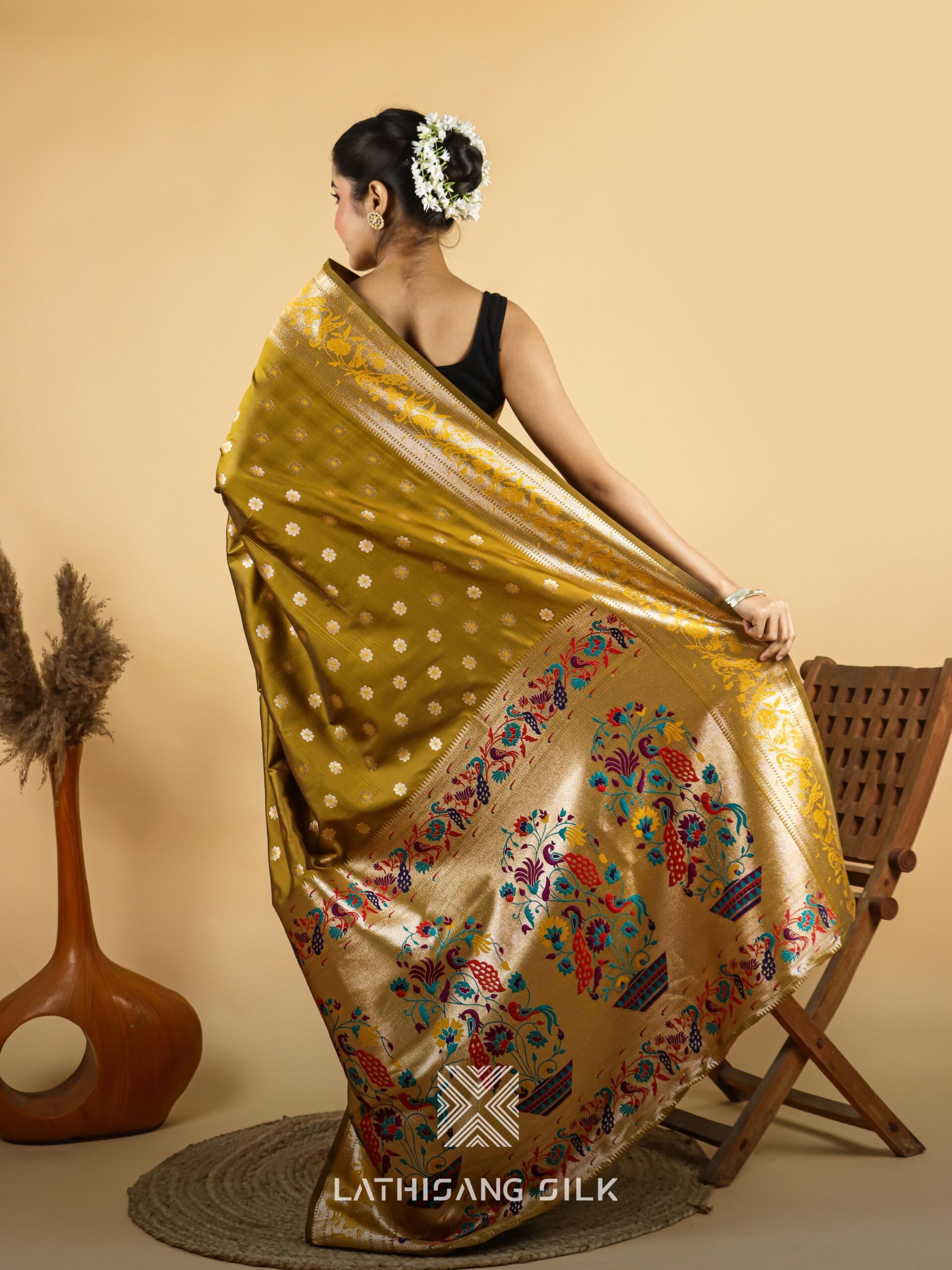 “This is a traditional Paithani silk saree, woven from high-quality silk that gives a rich shine and elegant drape. The saree comes in a mustard yellow base with classic butti (polka dot) detailing, reflecting authentic Maharashtrian craftsmanship.